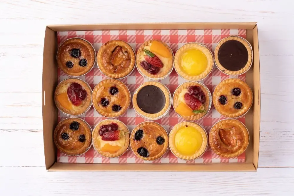 The small platter includes 12 assorted mini tarts that serve up to 6 people. The large platter has 24 assorted mini tarts that can serve up to 12 people at your Christmas morning tea office event. We recommend 2 tarts per person.