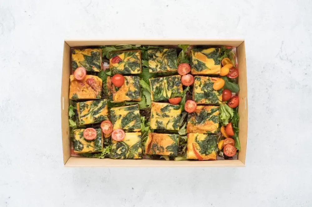 If you want something different from sweetness, buttery custards, tarts, jams, and creams, consider our Grilled Vegetables and Spinach Frittata. This box contains 16 pieces of decadent frittatas and adds some spice and twist to a tea event. They are made of free-range eggs and cooked to perfection. This ensures your office morning tea event is full of mouth-watering delicacies that your employees will love.