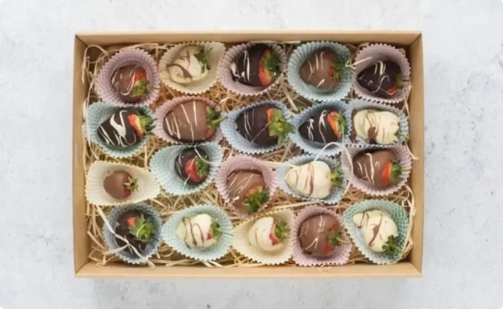 Chocolate-covered strawberries are a winning combination of seasonal flair and pleasure for your holiday workplace party. Each strawberry is coated in either rich dark chocolate or creamy white chocolate, resulting in a treat that’s as beautiful as it is tasty.