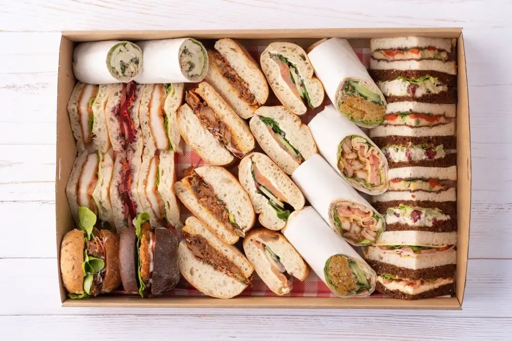 This box contains 30 sandwiches and is a great option for a festive office lunch. The sandwiches come with seven different fillings. There are also a couple of vegetarian options, meaning there is something for everyone in this box!
